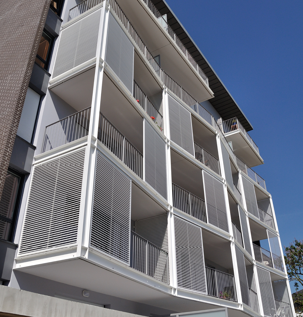 DUCO bietet mit seinem ausgeklügelten Sonnenschutzsystem DucoSlide ein vollständiges Sortiment an Schiebepaneelen. Der raffinierte Aluminiumrahmen kann beliebig mit unterschiedlichen Aluminium- oder Holzlamellenarten gefüllt werden, ggf. perforiert für ein faszinierendes Zusammenspiel zwischen Licht und Schatten. DucoSun ist eine strukturelle Lösung mit einem ausgezeichneten Ergebnis!