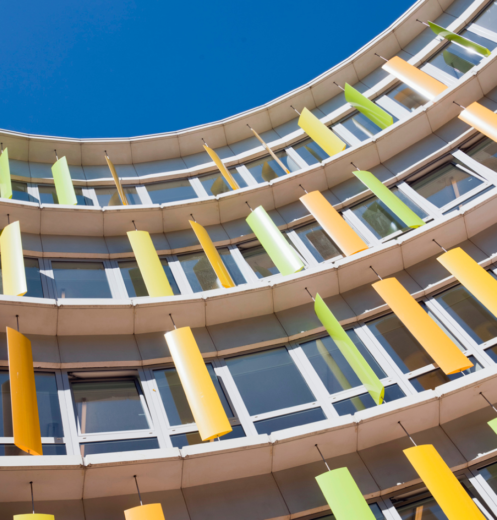 Architektonischer Sonnenschutz hält nicht nur die Sonnenhitze vom Gebäude fern, er sorgt durch das faszinierende Zusammenspiel mit der Fassade auch für eine besondere Ausstrahlung.